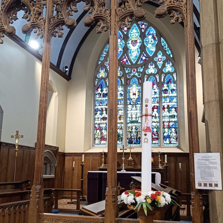 The stained-glass windows are by Kempe and Co. Look out for the wheat sheaf with the black castle in the centre in the corner of the windows. See the image below for the emblem on one of our windows.